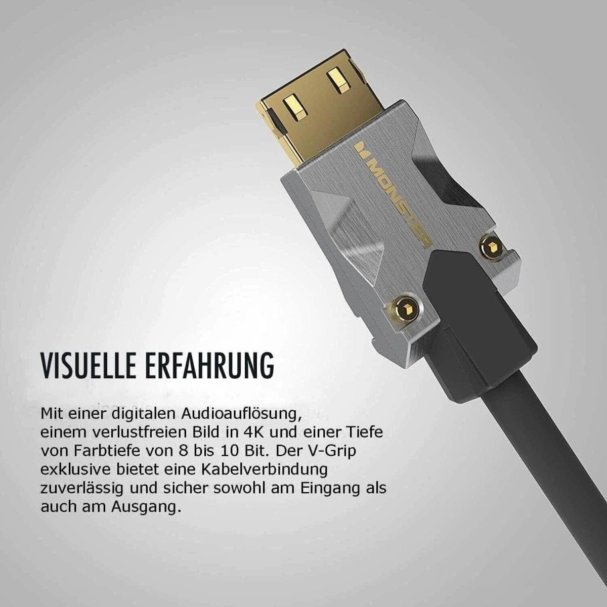 Patentētais Monster V-Grip™ savienotājs stingri noenkurojas HDMI ligzdā. Tas novērš signāla pārtraukumus nejaušas kabeļa atslābuma dēļ.